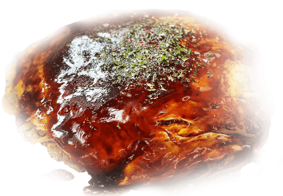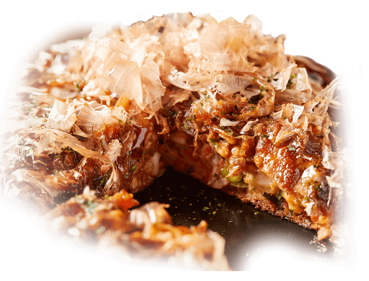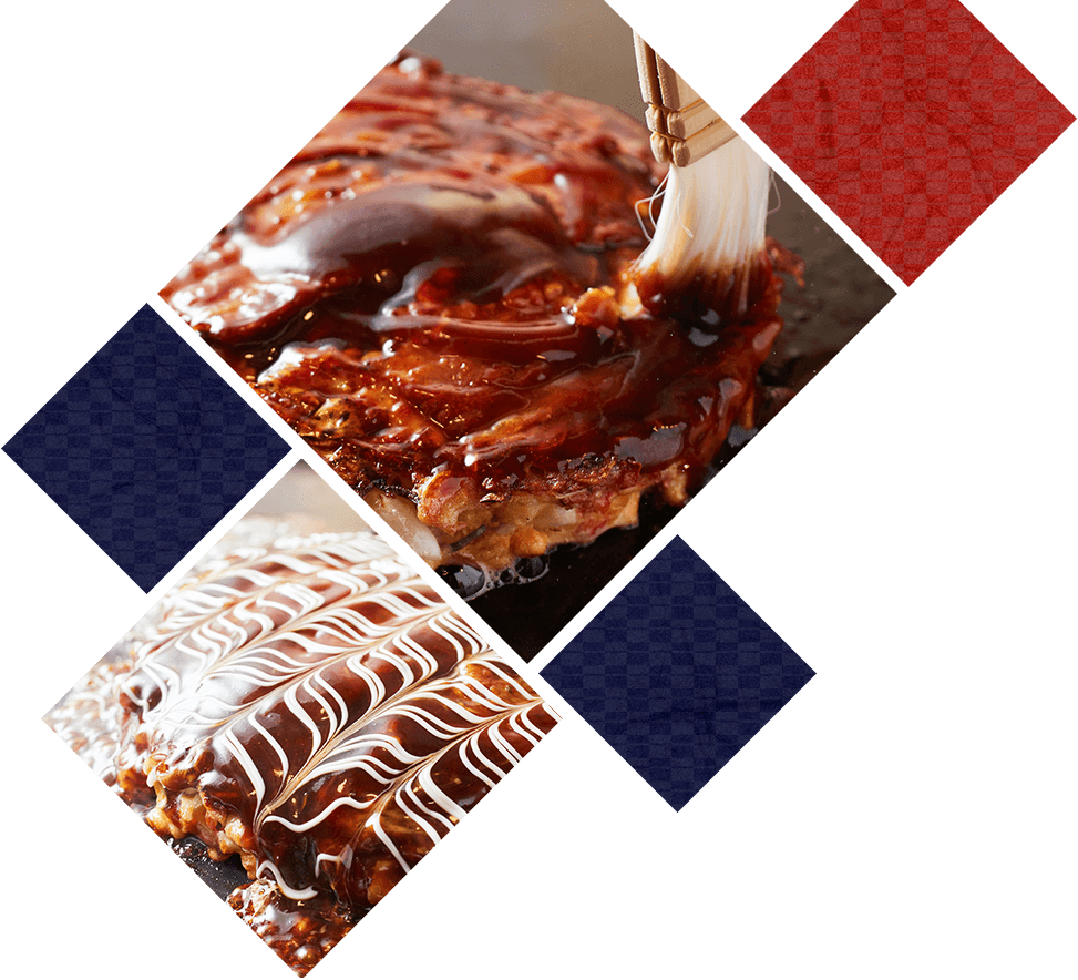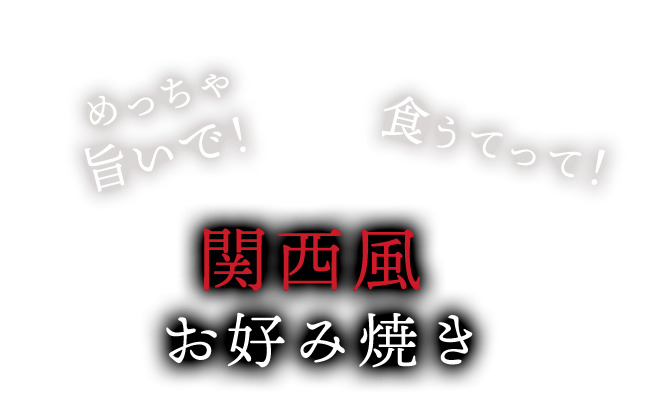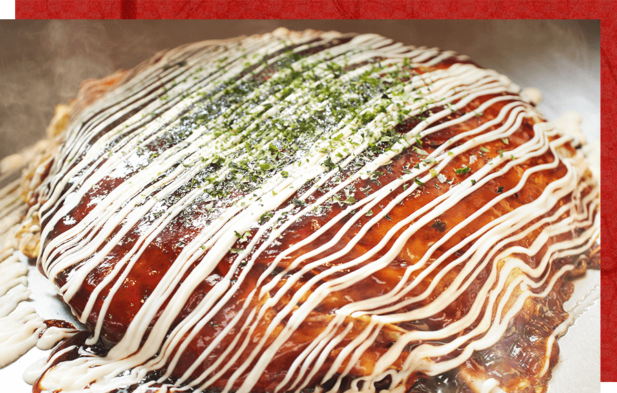 当店でご提供する関西風のお好み焼きは、ふんわりと軽い口当たりが特徴です!生地には、上質な小麦粉を使用し、鰹・鯖の混合出汁やコンソメ、九州産の甘口醤油を合わせて、やさしい風味に仕上げています。そこに長芋と卵白を独自の配合で加えることで、舌触りの良いやわらかい食感に。お召し上がりの際は、試行錯誤の末にたどり着いた黄金比率のオリジナルブレンドソースをあわせてどうぞ!