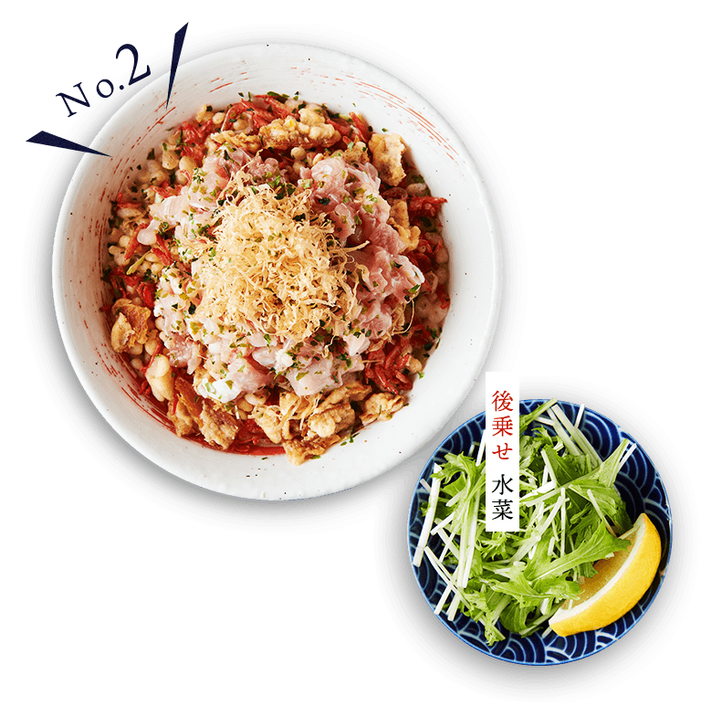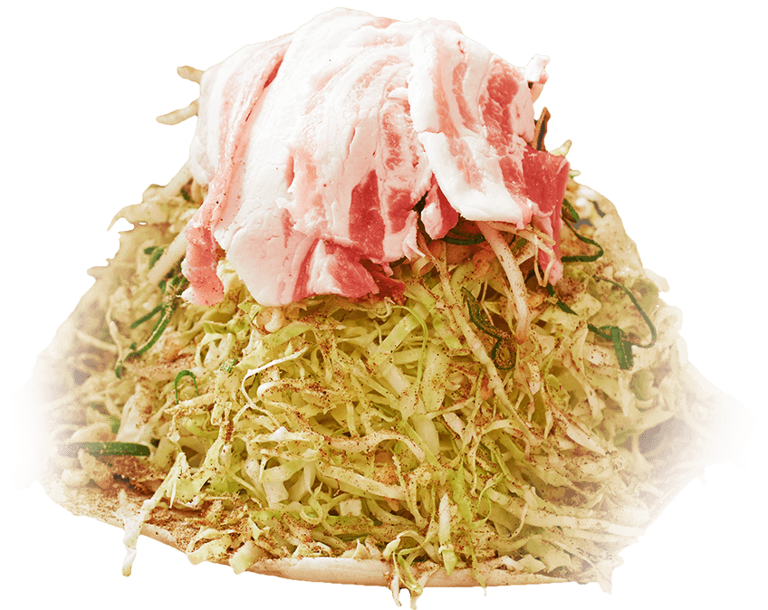 - あっさりとしていて食べやすいと評判の塩味のもんじゃ焼き。ゴロゴロと入れた鶏肉から溢れ出る旨みが口いっぱいに広がります。別皿の水菜をお好みでトッピングしてお召し上がりください。