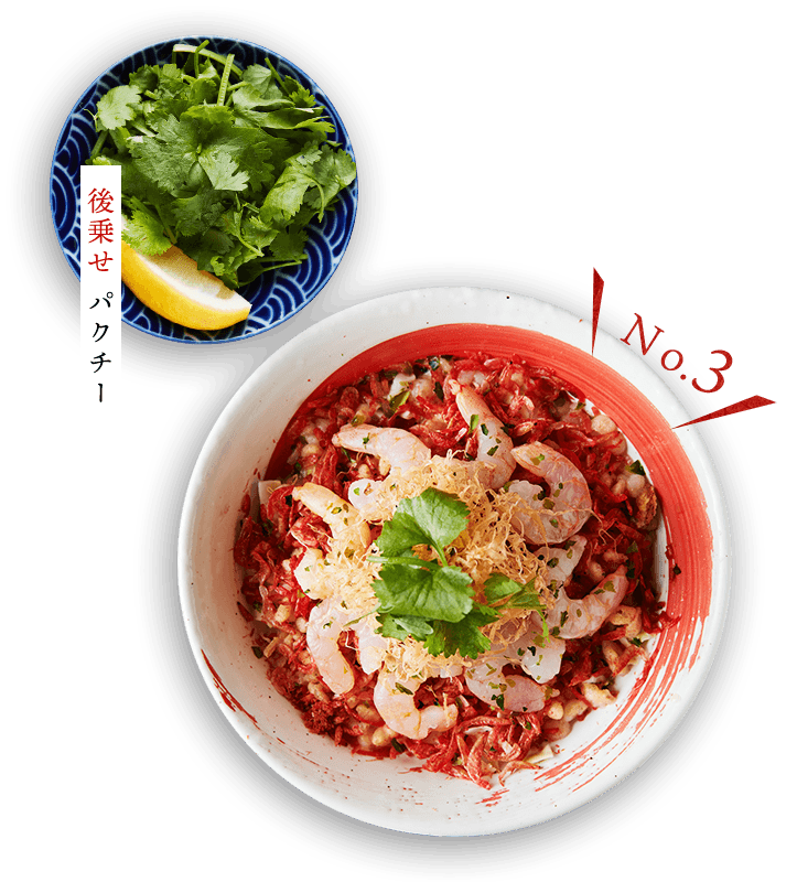 - タイ料理の代表“トムヤムクン”と掛け合わせたエスニック風の一品もぜひ。たっぷりの海老とパクチー入りで、ピリ辛な刺激が食欲をそそります。追いパクチーやパクチー抜きも可能です。